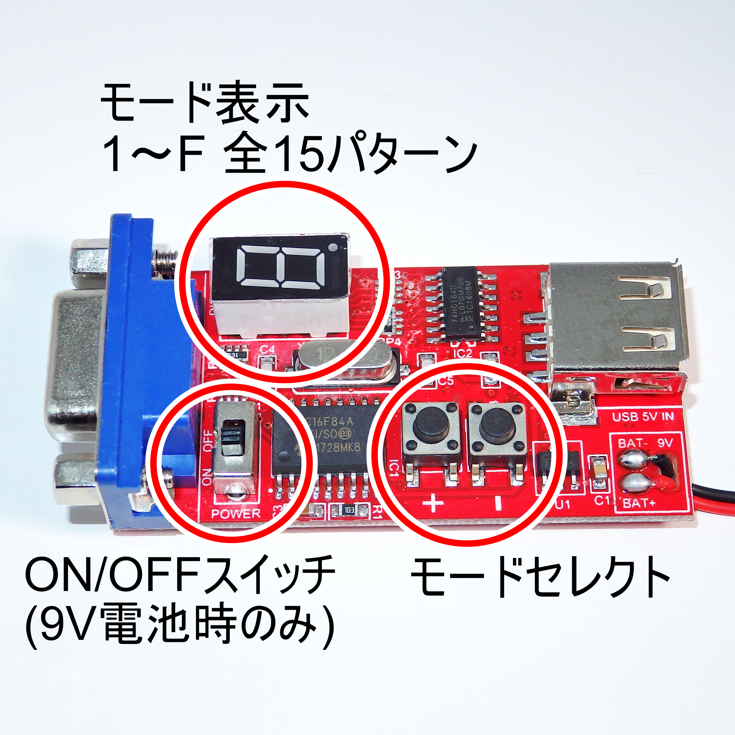 この製品は、VGAモニターに接続することで、テスト信号を出力し、