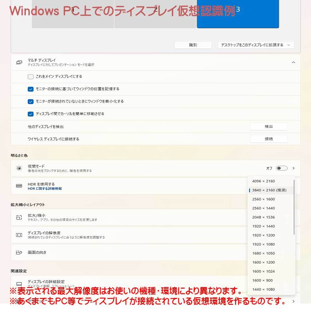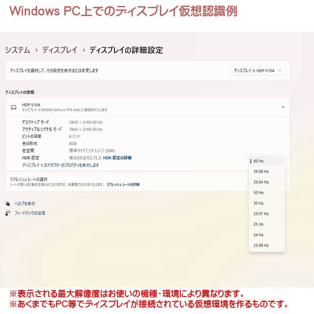 お使いの出力機器によって解像度、リフレッシュレートは変動致します。