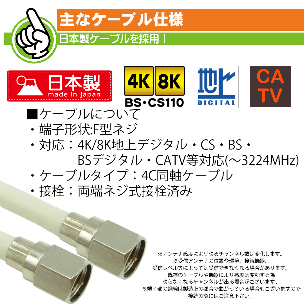 4K/8K対応の地デジ、BS、CS、CATV対応の同軸アンテナケーブルです。