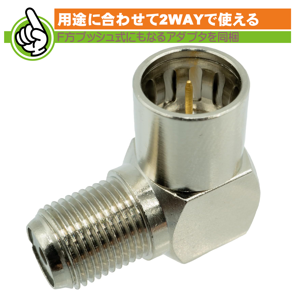 L型のプッシュ式変換アダプタが1個、付属しており狭い場所やケーブルを逃がしたいときに