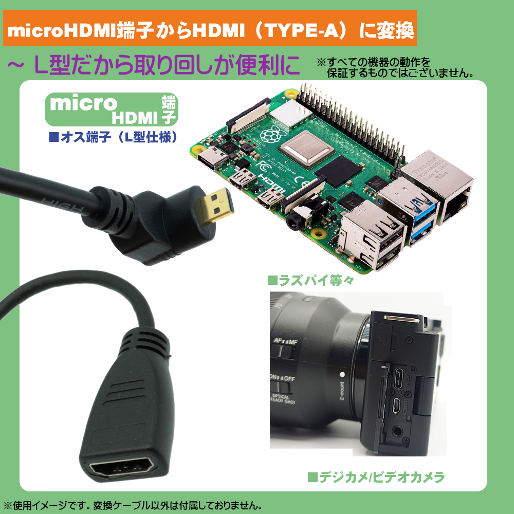 microHDMIを通常のHDMIに変換することでデジカメ、ビデオカメラ、ラズパイ等のmicroHDMI搭載機器を